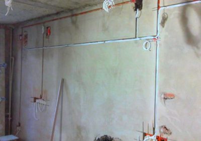 По действующим нормам в новых домах и квартирах прокладка электросети проводится над подвесным потолком или стяжкой проводом от трех до пяти жил. Для подводки проводов к розеткам и выключателям сверху делаются штробные каналы. Розетки и выключатели коробки устанавливаются в распределительных коробках-углублениях. Вся силовая проводка подводится к электрощиткам.