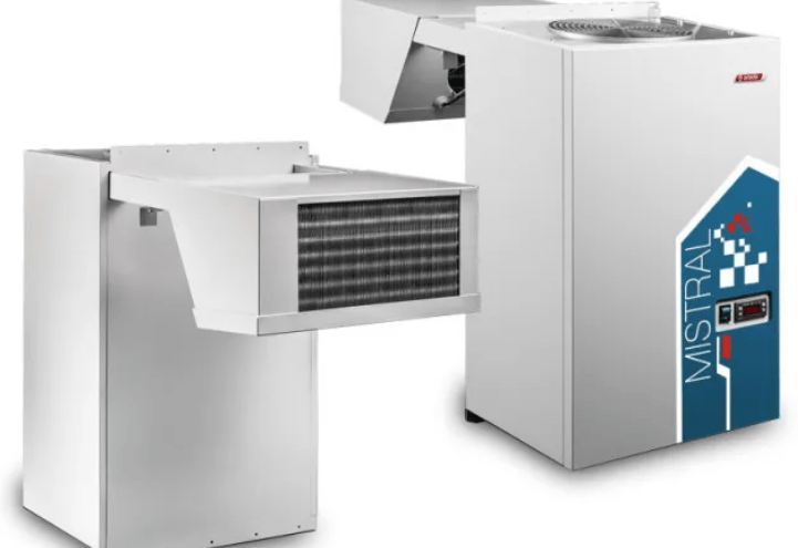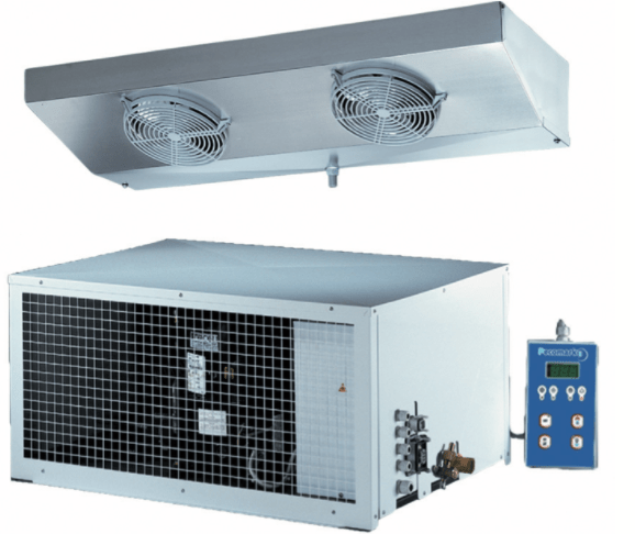 В холодильных моноблоках имеются внутренний блок (воздухоохладитель) и наружный блок (компрессорно-конденсаторный агрегат), которые соединены термоизоляционной прокладкой из полиуретана в единую конструкцию. Моноблоки чаще используют в камерах небольшого объема (например, в сфере торговли).