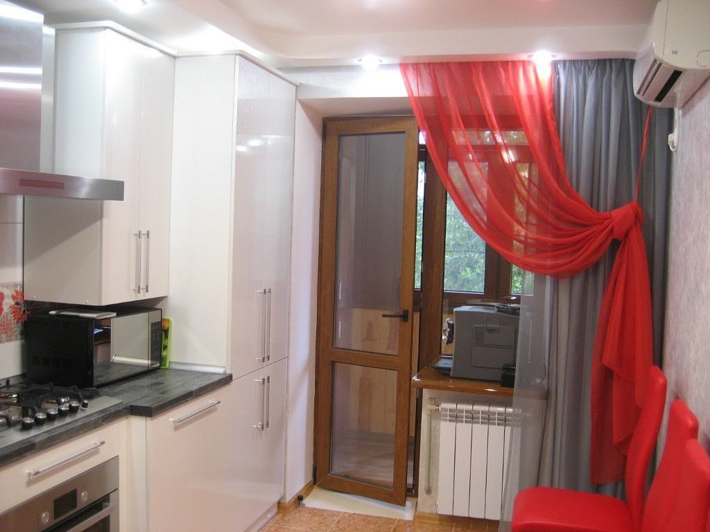 Только после этого необходимо приступать к подбору цветовой палитры занавесок, которая будет гармонично смотреться и не будет визуально разделять балконную дверь и кухонное пространство.