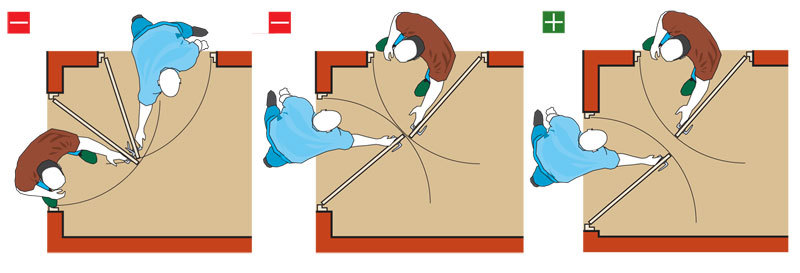 При угловом расположении входного проема дверь должна открываться в направлении ближней стены, чтобы входящий человек мог сразу наблюдать все, что находится в помещении.