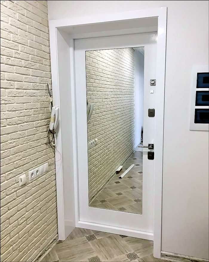 Белая входная дверь может быть со стеклом в виде зеркала. Его располагают на внутренней поверхности полотна, поверх любой из отделок.