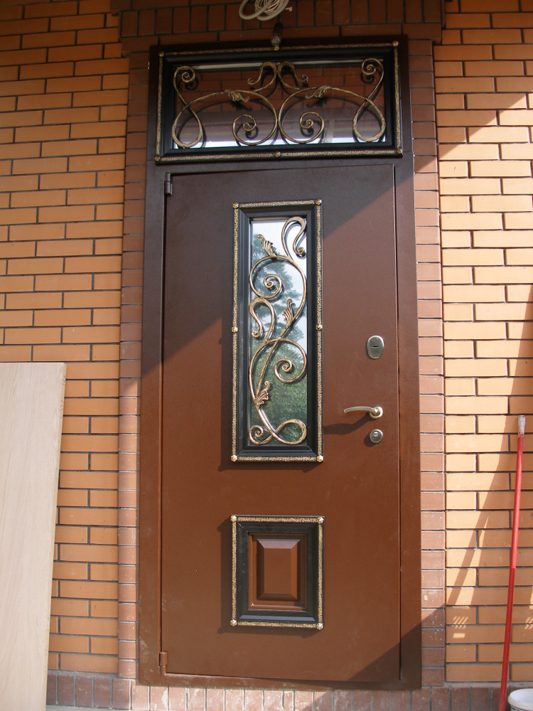 Металлическая входная дверь в квартире или частном доме с фрамугой может быть декорирована разными материалами. Например, при изготовлении фрамуги в форме арки можно использовать отдельные кусочки декоративного стекла, а между ними вкладки из дерева. Здесь все зависит от фантазии владельца жилого дома и общего оформления, например, фасада коттеджа и прихожей.