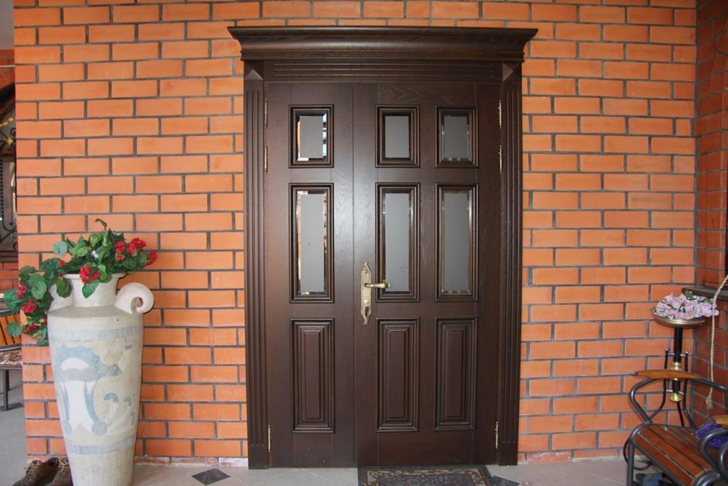 Перед тем, как купить дверь, стоит обращать внимание на внешнее оформление самого здания, например, для кирпичного дома идеальным вариантом станет приобретение конструкции со вставками стекла. Но в этом случае ее стоит обезопасить решетками.