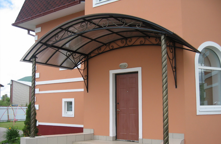 Полукруглые навесы для крыльца ранее вырезали из металлических листов. Сегодня чаще используют прозрачный сотовый поликарбонат. Этот стройматериал достаточно легкий, хорошо гнется, поэтому с ним легко работать. При этом конструкции с использованием поликарбоната выглядят презентабельно.