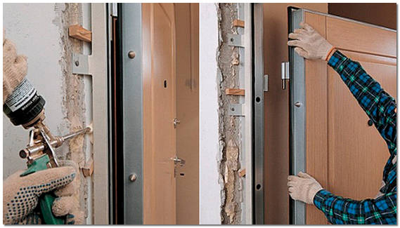 Основными способами закрепления коробки в процессе установки входных дверей являются: