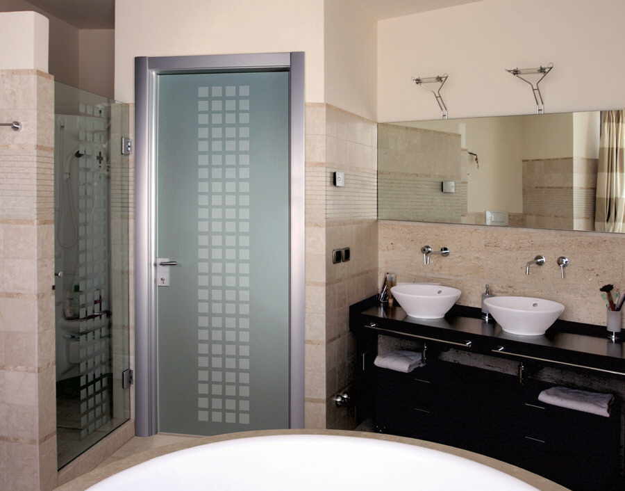 Стеклянные двери для ванной и туалета изготавливают из высокопрочного стекла. Оценить масштабы ассортимента таких полотен можно по фото изделий любого из производителей. В продаже обычно имеются модели с матовым, рельефным или зеркальным покрытием. Высокопрочное стекло очень проблематично повредить, поэтому если на двери появились трещины, не имеющие серьезной причины, — вам попалось изделие из некачественного материала. Еще один плюс конструкции из стекла заключается в зрительной невесомости конструкции за счет полупрозрачности материала. Использование стекла в интерьере ванной позволяет визуально увеличить объем небольшого помещения.