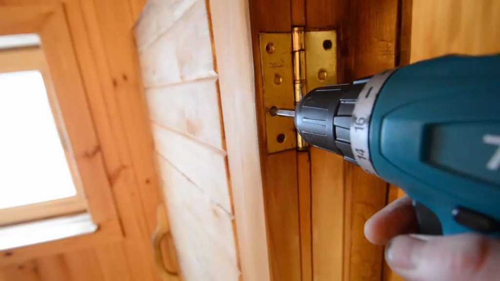 Перед тем, как будет проведена установка деревянной двери в бане со сруба, необходимо к бруску прибить косяк. Таким образом, в случае усадки здания его можно будет поднять на высоту зазора. И последний шаг – навешивание полотна и крепление замка.