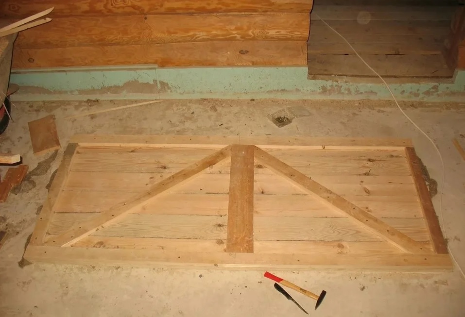 Самый простой вариант – полотно из досок складывается на ровном половом основании, сверху набивается подкос и шпонки. Но можно усложнить задачу, сделав дополнительно выемки в досках под поперечные бруски. Такая конструкция прочнее, но из-за сложности сборки большинство хозяев предпочитают первый способ.