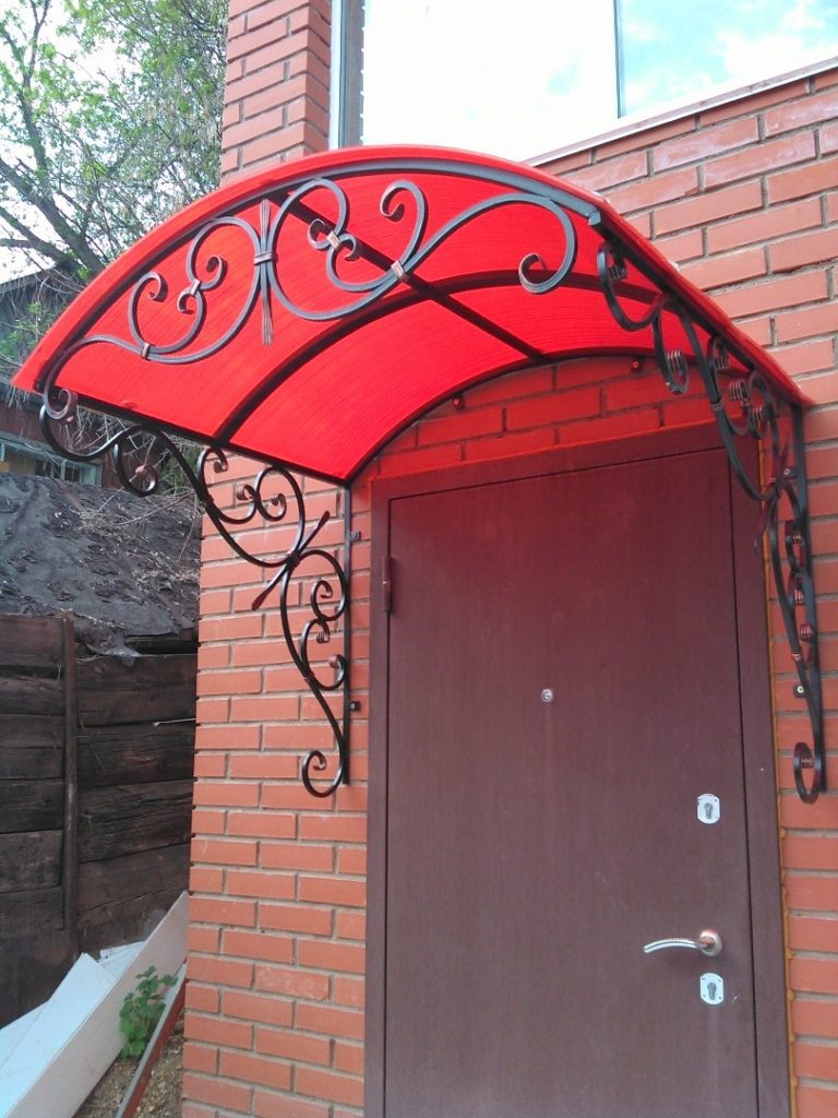 Следующий шаг – выгнуть из квадратов или арматурного прута различные фигурные элементы. Их вставляют в каркас и также приваривают во всех местах соприкосновения. Далее все работы с каркасом проводятся аналогично первому варианту: грунтовка, покраска, фиксация саморезов, крепление конструкции над дверью и монтаж листов поликарбоната.