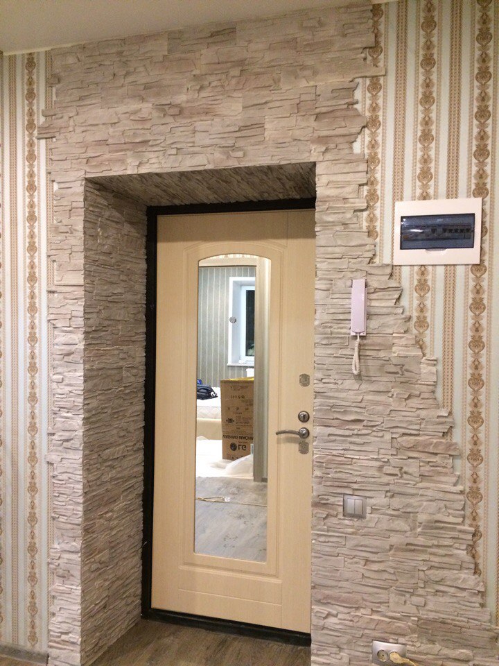 Чаще всего декоративный камень используют для отделки входных проемов магазинов, кафе, общественных зданий. Этот материал не только придает входу более привлекательный внешний вид, но и защищает стены от механических повреждений. Но и отделка входной двери изнутри декоративным камнем также становится все более популярной.
