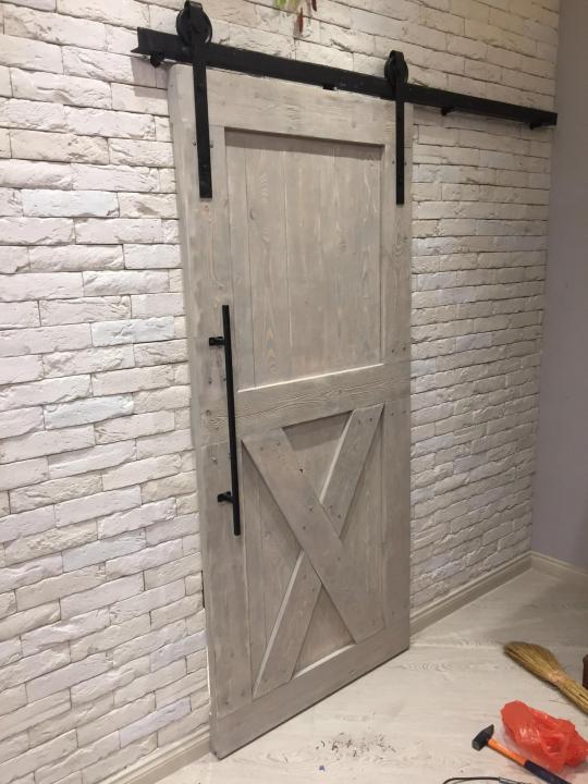 Больше всего в жилых помещениях популярны раздвижные индустриальные дверные конструкции. Самой простой является амбарная дверь, собранная из грубых досок, скрепленных поперечиной. Главным условием выступает отсутствие любого глянца. Изделие устанавливается на рельс и двигается вдоль стены. Размеры такой конструкции зависят только от ширины проема, который нужно закрыть.