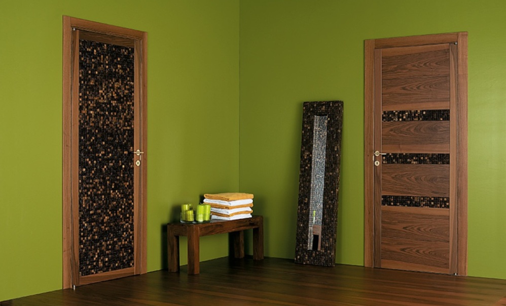 Будет кстати сказать, что выбор дверей и пола одного цвета — несколько рискованное решение. В результате обитатели жилища могут получить скучный и весьма раздражающий интерьер. В крайнем случае следует подобрать разные оттенки для дверей и напольного покрытия. В качестве примера можно привести сочетание тёмно-зеленого пола из керамической плитки с золотистыми декоративными элементами с дверью на несколько тонов светлее. При этом ручки и петли должны быть выполнены из жёлтого металла в соответствии с тоном платочного панно.