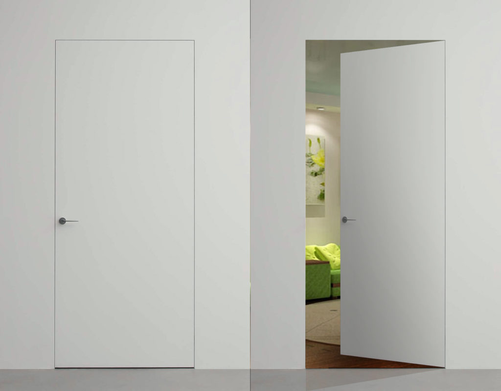 - Скрытый эффект двери происходит благодаря петлям, которые вмонтированы в раму. Перед тем как приобрести конструкцию необходимо определиться с ее типом – под отделку или заводское изделие;
