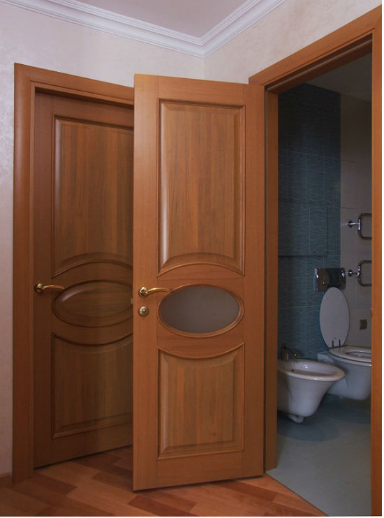 В санитарные помещения с повышенной влажностью рекомендуется устанавливать двери, выполненные из натурального шпона и экошпона. Это объясняется тем, что двери МДФ под воздействием влаги и перепадом температур вздуваются и теряют первоначальный эстетичный внешний вид, а двери из массива дерева слишком тяжелые для тонких стен. Кроме того, натуральное дерево без покрытия специальными антисептическими составами под воздействием тепла и влажности становится благодатной почвой для развития грибковых спор и плесени.