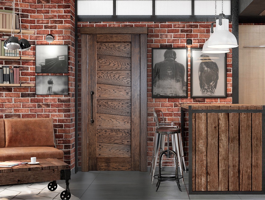 Для изготовления двери в стиле лофт подойдет любая древесина, имеющая яркую и четкую текстуру. Но важно учитывать место, где будет установлена дверная конструкция, например, если это кухня или ванна, то стоит остановить свой выбор на дубе или ольхе, которые максимально устойчивы к смене температуры и имеют достаточно высокую стоимость. К ним также стоит отнести сосну, бук, красное дерево и венге.