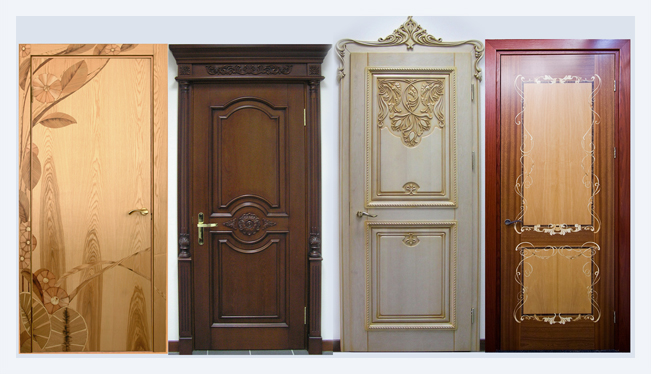 В качестве художественного оформления дверных полотен часто применяют резьбу по дереву. С ее помощью создают орнаменты в угловых частях полотна. Также резьба может быть выполнена на различных декоративных вставках.