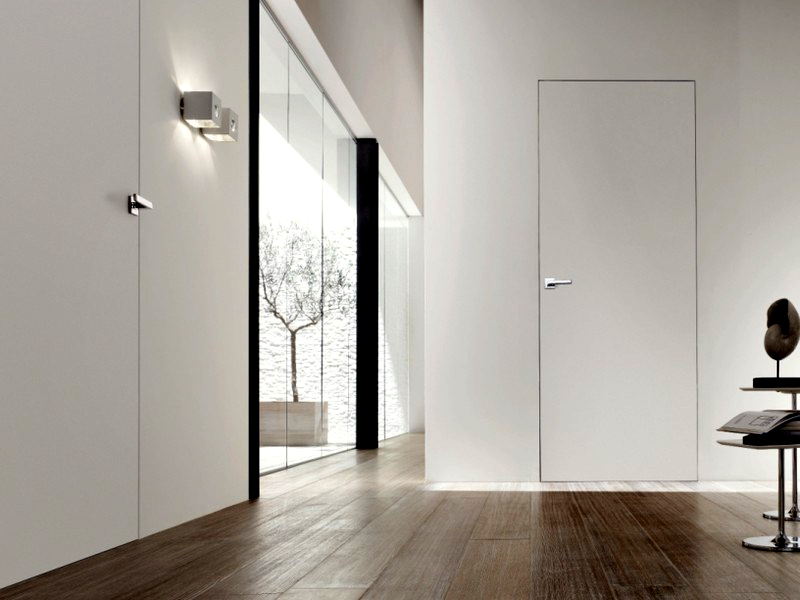 В основе конструкции – рама из алюминия. Она на этапе монтажа устанавливается полностью вровень с поверхностью стены. Там же располагаются скрытые дверные петли. В этих дверях не предусмотрены наличники, что делает это изделие практически незаметным, когда дверь закрыта.