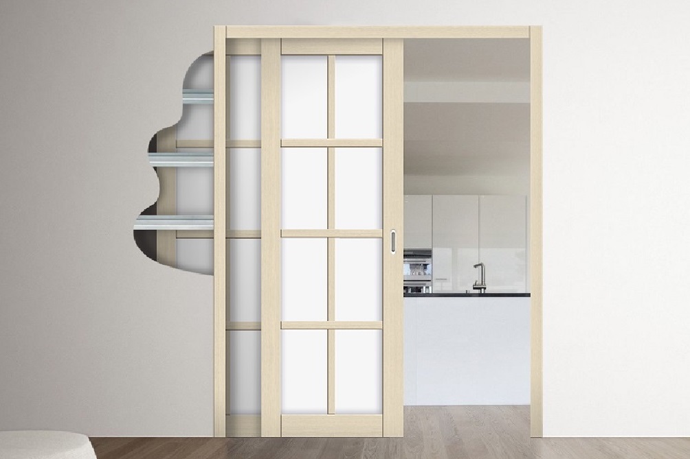 На такие двери устанавливают только специальную фурнитуру, которая не выступает за плоскость полотна, чтобы не мешать ему свободно заходить внутрь стены.