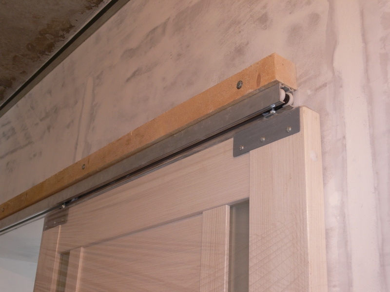 Далее брус с рельсом накатывается на ролики полотна, двери приставляются к проему, на стене делается разметка для закрепления направляющей конструкции. Обязательно необходимо добавить около 1 см, чтобы нижняя часть полотна не соприкасалась с половым основанием. А если планируется дополнительная укладка напольного покрытия, тогда необходимо учесть также его толщину. Крепежных элементов должно быть минимум 4.