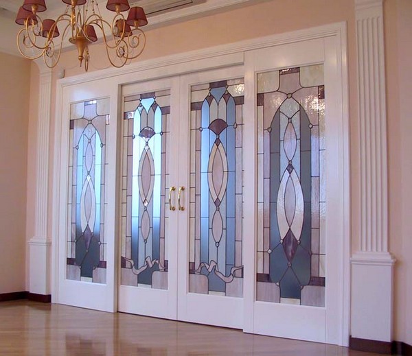 Применение витражных композиций в раздвижных дверях позволяет не только создать яркий образ и украсить помещение, но и насытить его тем количеством света, которое необходимо. Так, исходя из вида витража и материалов конструкции, межкомнатная дверь с витражами может иметь как прозрачные стекольные вставки, так и фактурные элементы с применением лаков и пленочных покрытий.