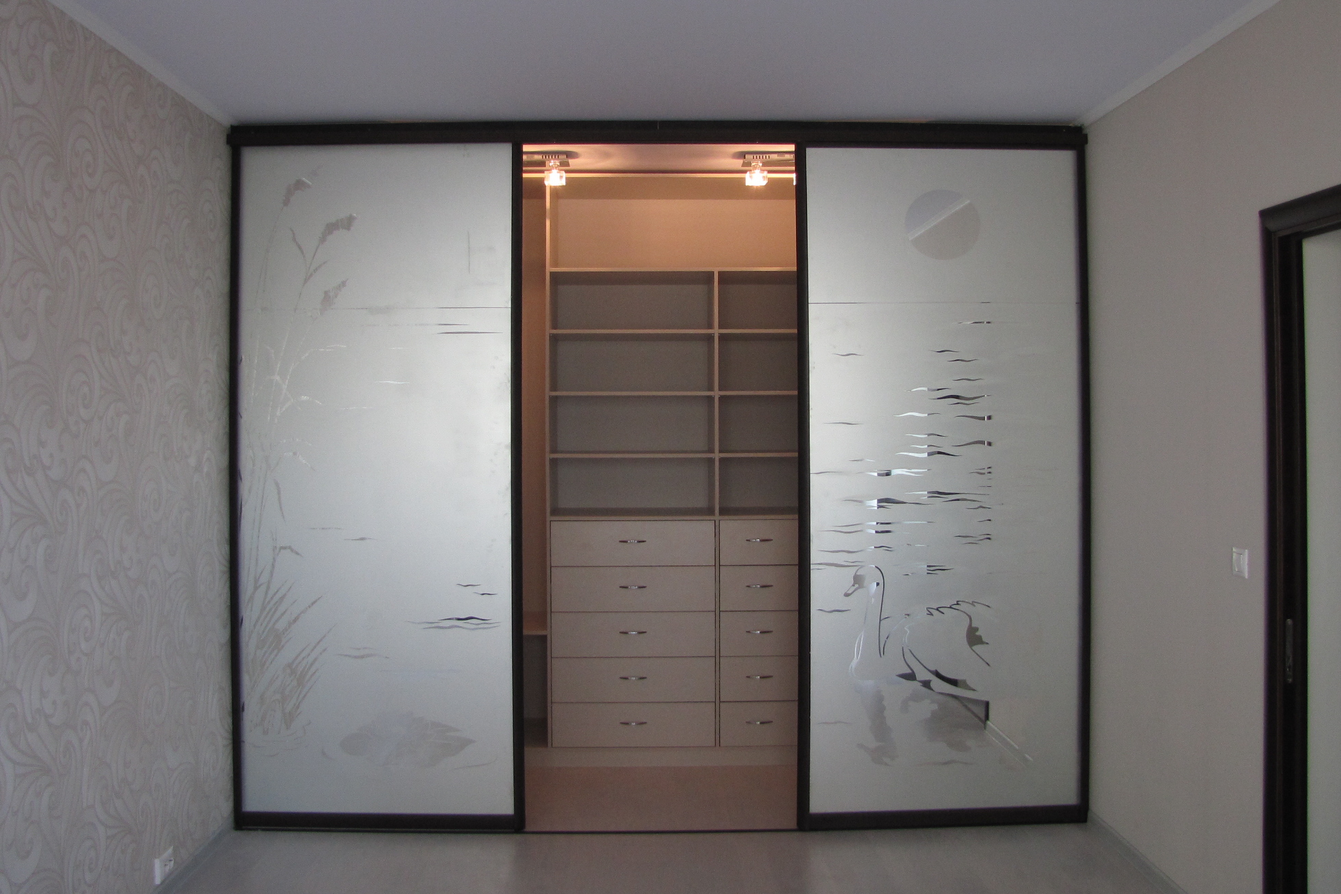 Яркость и оригинальность способны добавить конструкции с применением колорированного пластика, стекла, металла и зеркала в различных комбинациях. Также само стекло может иметь матовое покрытие или особый рисунок. Благодаря применению в двери купе для гардеробной особых технологий в процессе изготовления стеклянных панелей, такое изделие станет не только прекрасным украшением комнаты, в чем можно убедиться, рассмотрев различные фото, но и весьма безопасным. В случае повреждения полотна осколки будут удерживаться специальной покрытием-пленкой и не рассыплются на пол.