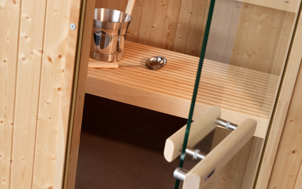 Стеклянный дверной блок будет пропускать неяркий рассеянный свет в парилку. Это поможет создать в данном помещении максимально расслабляющую атмосферу для отдыха.