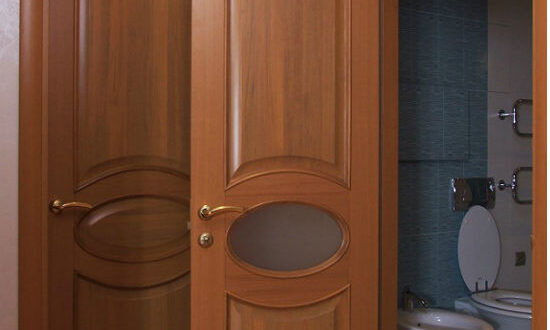 Сантехнические двери в ванную и санузел выделены в отдельную категорию, так как значительно отличаются в размерах от входных и комнатных дверей. Так, например, в типовых панельных многоэтажках в