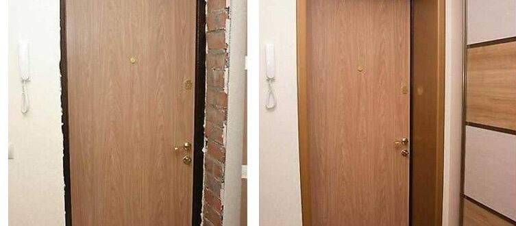 Как правило коробка межкомнатной двери идеально подходит к толщине внутренней перегородки. Но даже самая массивная внешняя дверная конструкция своей луткой не перекроет до конца толщину наружной стены. Остаются