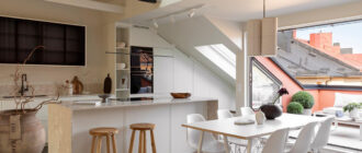 Теплые стены и светлая мебель и декор в тон — эта просторная мансардная квартира