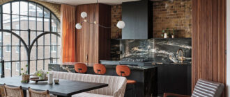 Два роскошных арочных окна делают открытую гостиную этой небольшой лофт-квартиры в Лондоне очень эффектной.