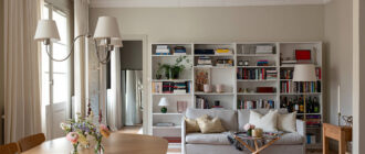 Спокойную атмосферу в этой шведской квартиры разбавляет лишь книжный шкаф в гостиной — книги