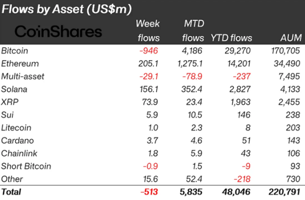 Продукты на основе биткоина (BTC) оказались единственным инструментом, не считая фондов на базе корзины монет (-$29,1), которые зафиксировали оттоки — $946 млн.