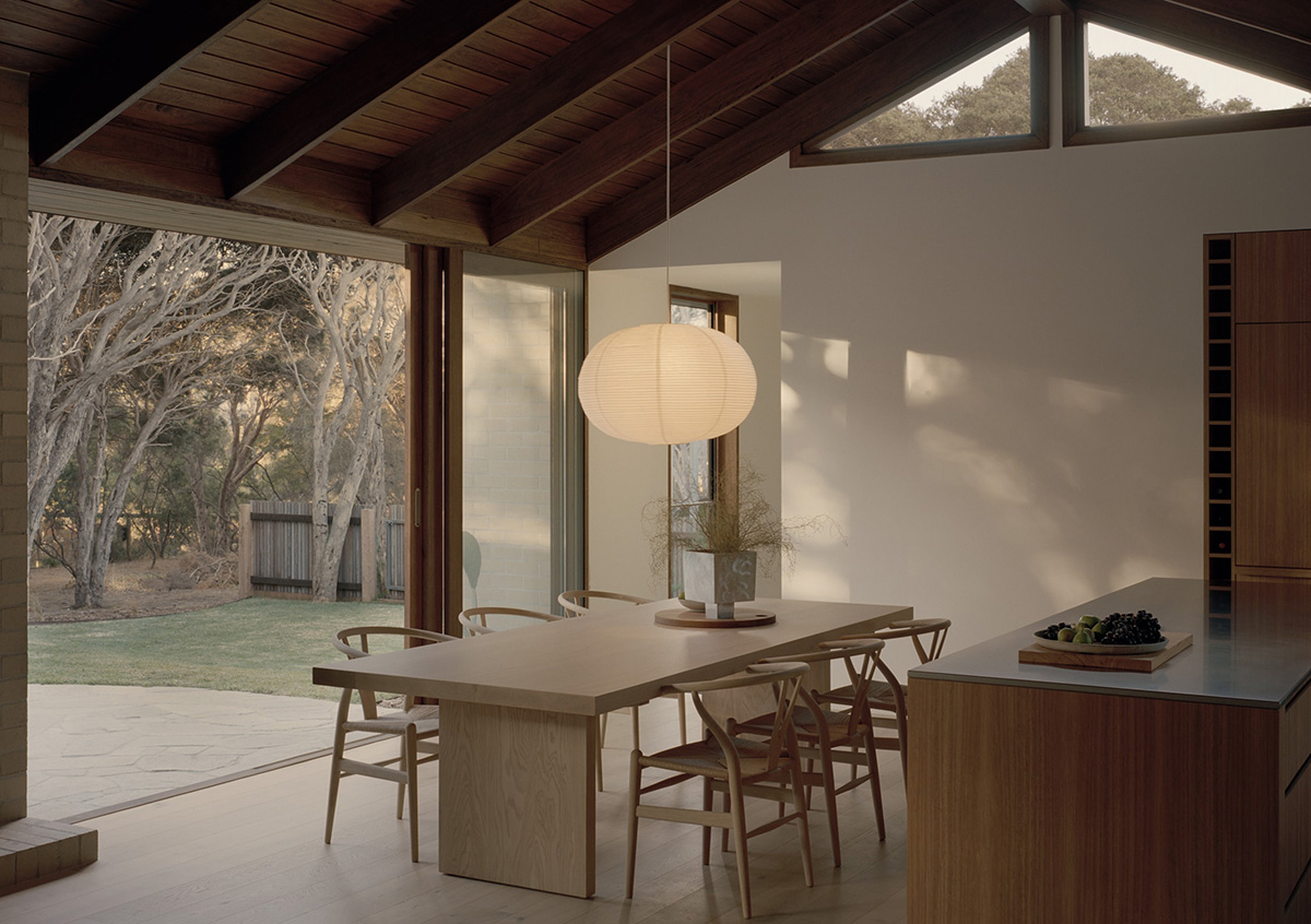Красота и тепло натурального дерева и приятное естественное освещение — интерьер этого дома в Австралии радует глаз невероятно уютной и согревающей аурой. Пространство минималистично в своей сущности: стеклянные стены, открытая планировка, нет загромождения декором. В дизайне мебели ощущается сильное влияние японского стиля и философии жизни, которые среди прочего означают наслаждение простой красотой всего натурального. Прекрасная работа студии Victoria Merrett Architects!