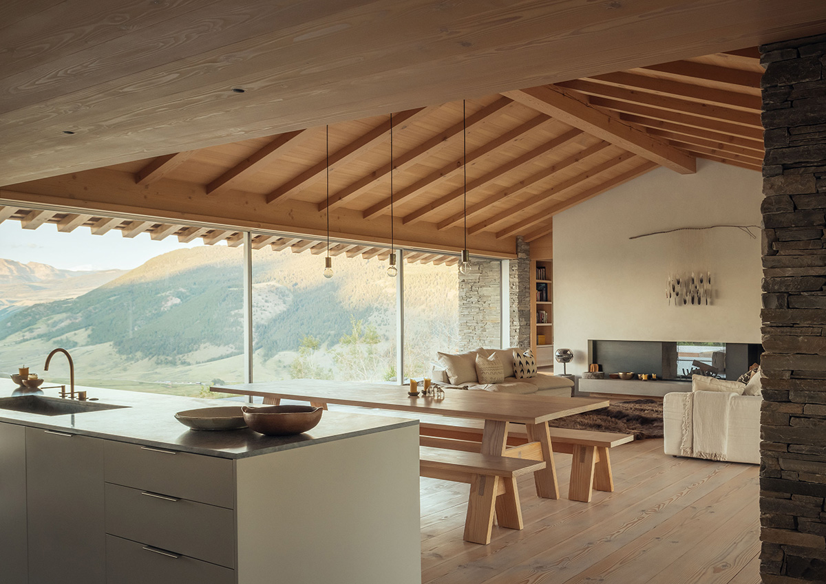 Самое впечатляющее в этом горном домике в штате Вайоминг — это роскошные виды на много километров из открытой гостиной через огромные панорамные окна. Сам дом снаружи отделан камнем выглядит довольно скромно — видно, что архитекторы постарались максимально незаметно вписать строение в восхитительную природу. Не изобретая велосипед, дизайнеры построили дизайн интерьера на многочисленных деревянных поверхностях, но сделали мастерски и это с чувством вкуса. Райское местечко!
