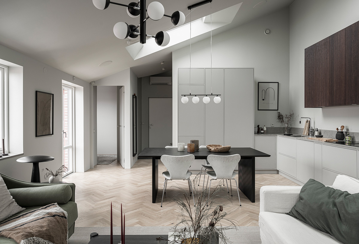 Секрет привлекательности этой небольшой современной мансардной квартиры в Гетеборге состоит из нескольких моментов. Во-первых, это интересное пространство со скошенными потолками и большим балконом, который летом превращается в дополнительную комнату под открытым воздухом. Во-вторых, цветовая гамма, состоящая и сдержанных и приглушенных оттенков нейтральной палитры, которые не бросаются в глаза, но создают приятную ауру. Ну и наконец, открытая планировка гостиной и кухни, позволяющая хозяевам не только проводить качественное совместное время, но и удобно принимать друзей. Enjoy!