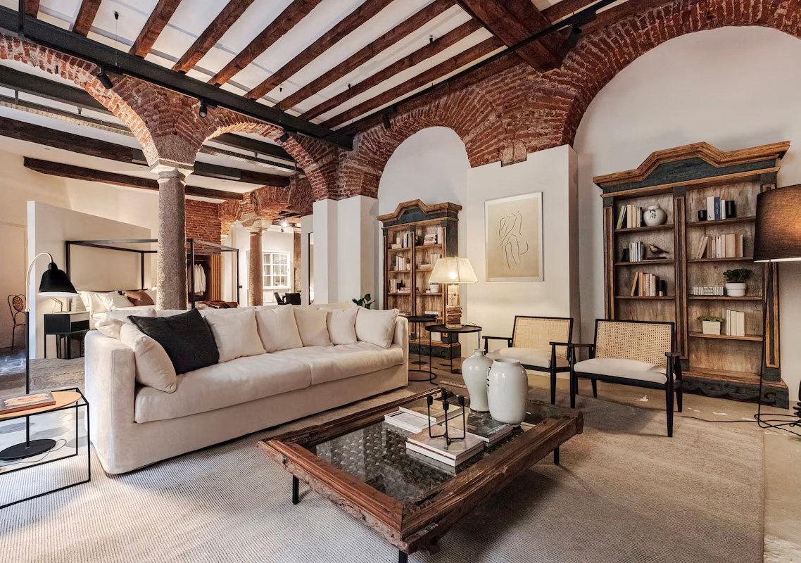 И снова Италия впечатляет невероятным интерьером, корни которого уходят в 12 век. Эти апартаменты находятся в самом сердце Милана, в районе Дуомо, в здании, которое в Средние века было монастырём. Отсюда нестандартная планировка и зонирование квартиры. Но главный wow-фактор этого жилья — конечно же, впечатляющие кирпичные арки и колонны, их подпирающие, а также оригинальная плитка на полу. А вы бы хотели пожить в таком интерьере?:)