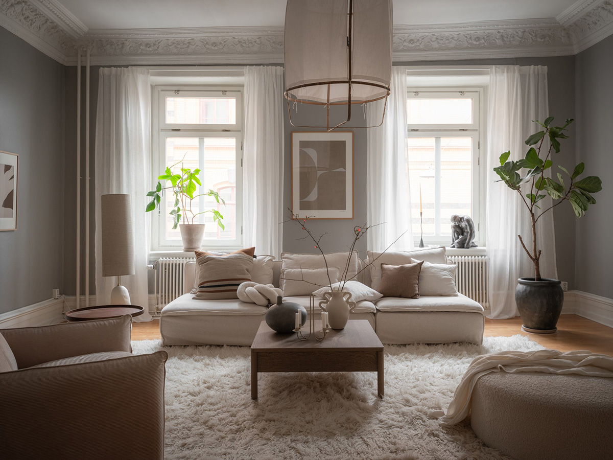 Обильная лепнина и старинная печь в этой шведской квартире удачно противопоставляется нежной пастельной цветовой гамме и светлому однотонному декору. Пространство воспринимается очень мягким и обволакивающим, а элегантные классические детали придают вневременных эстетических ноток. Спальня и вовсе почти белоснежная, словно облако — даже через фотографии чувствуется её воздушность. Приятный скандинавский интерьер!