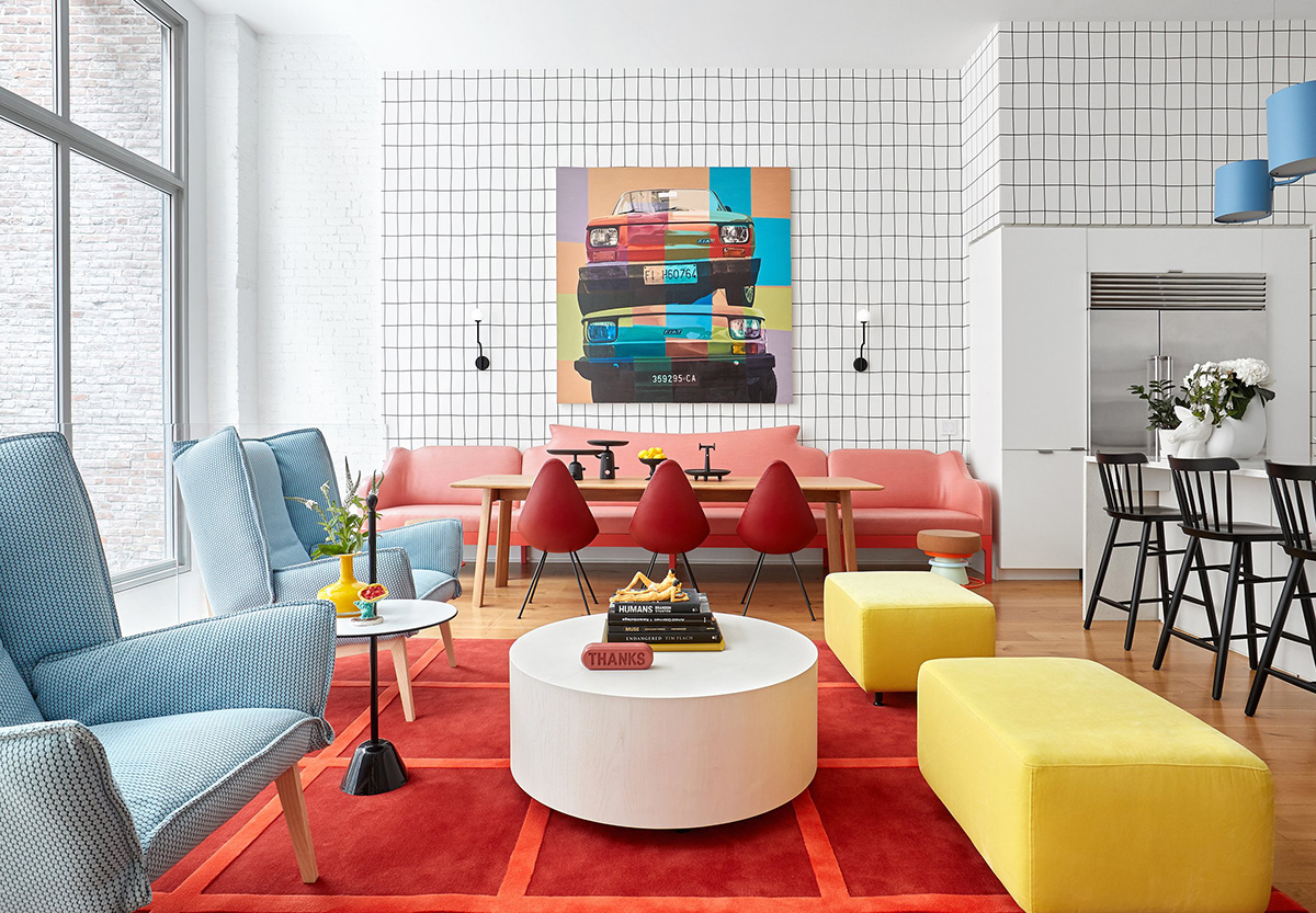 Этот лофт в Нью-Йорке — невероятный микс атмосферы бутик-отеля и впечатляющего индустриального интерьера. Вместо покраски на стенах этих апартаментов мы видим геометрические и другие яркие обои, постеры, экзотическую роспись и современное искусство. Добавьте сюда ещё и причудливую современную мебели и пёстрые принты — получится жилое пространство, которое не оставит никого равнодушным. Очень смелый интерьер!