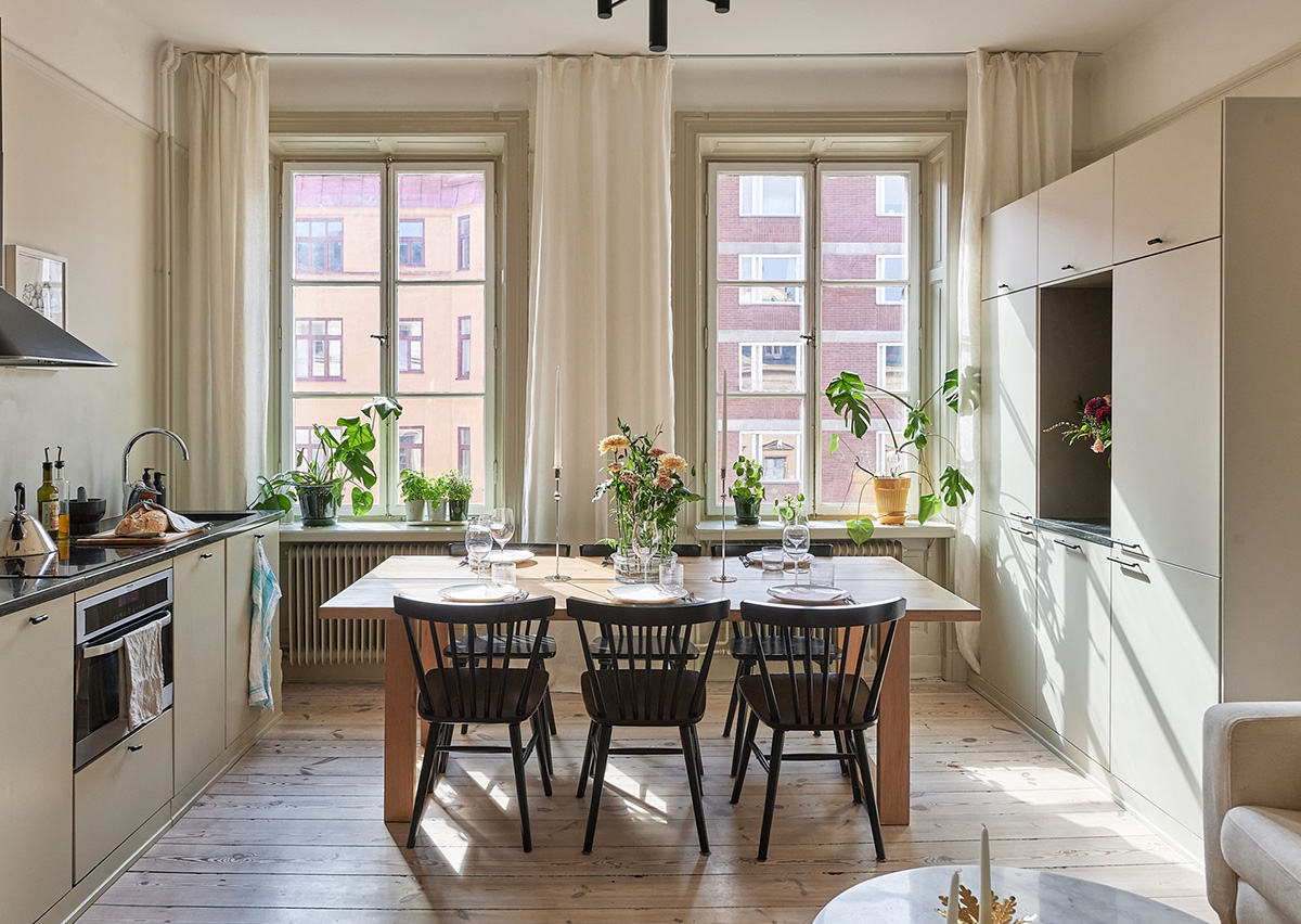 Эта трехкомнатная квартира в Стокгольме довольно удачно спланирована. На всего 65 кв. м общей площади поместилось целых три комнаты, при чём объединенная гостиная с кухней выглядит довольно просторно и практично. Цветовая гамма лёгкая и спокойная, теплые пастельные оттенки выбраны из почти монохромной палитры. В целом это очень приятный и комфортный скандинавский интерьер!