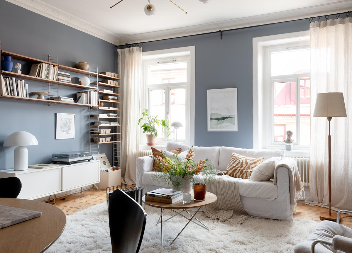 В гостиной этой шведской квартиры ми видим очень приятное сине-белое сочетание. Красивый и интересный оттенок стен был удачно смягчен белыми диваном и текстилем, создающими воздушный эффект в интерьере. Прохладные нотки чувствуются также в декоре кухни, в то время как спальня и детская получились светлыми и чистыми. Enjoy!
