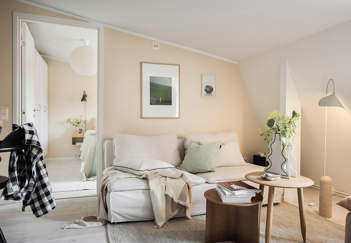 Этот шведский интерьер подкупает своей простотой и понятным уютом. Маленькие пространства со скошенными потолками не впечатлят искушенных зрителей, но лёгкая комбинация персиковых акцентов, деревянных деталей и скандинавской мебели создаёт очень приятные впечатления от просмотра. Отличный вариант для молодой пары или одинокого проживания!
