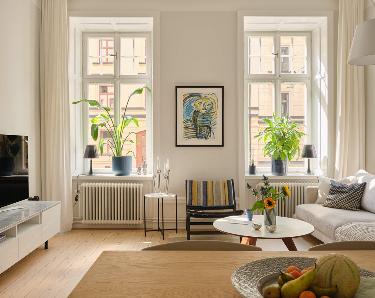 Как мы знаем, естественный свет — главный союзник скандинавских дизайнеров. Если пространство позволяет, они всегда будут выстраивать декор таким образом, чтобы подчеркнуть и усилить дневное освещение в интерьере. Эта светлая квартира в старом доме в Стокгольме — отличный тому пример. Высота потолков делает комнаты просторными, а высокие окна обильно заполняют её светом — к таким исходным условиям дизайнеры подобрали максимально светлый декор. Ну а свежие акценты и живые растения наполнили дом жизнью. Enjoy!