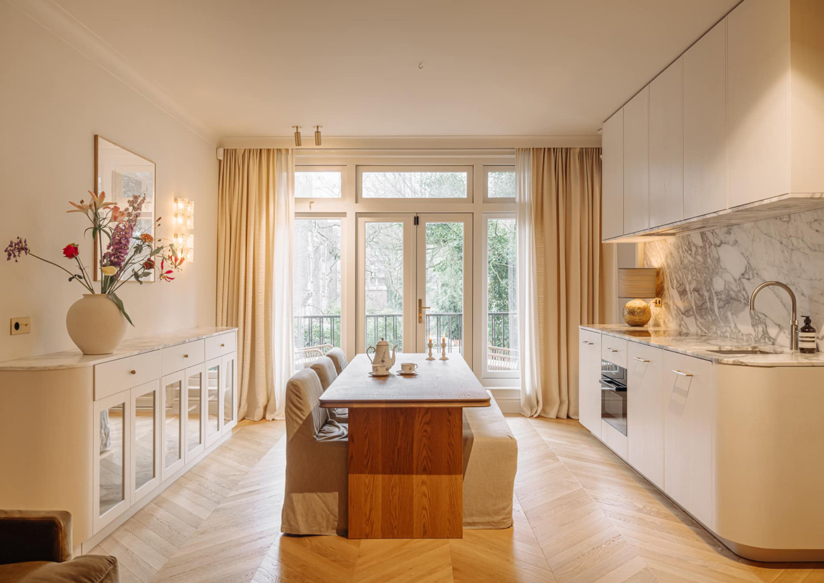 Мы легко можем узнать где находится эта элегантная современная квартира уже по внешнему виду дома, в котором она расположилась — эти очаровательные вековые здания из красного кирпична на берегах знаменитых каналов Амстердама не перепутаешь ни с чем. Апартаменты недавно были отреставрированы в соответствии с последними трендами в дизайне: скруглённые формы, теплые натуральные тона, светлый текстиль и нотки ар-декор. И пусть окна здесь выходят не на канал, а на внутренний двор, атмосфера в этом интерьере просто замечательная. Отличное современное жильё!