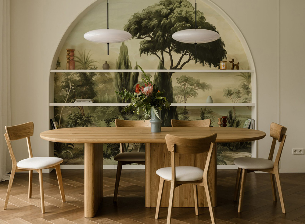 В архитектуре этого частного дома в пригороде Варшавы преобладают классические лини и пропорции, а вот дизайн интерьеров построен на современных приёмах и модных решениях. Дизайнеры студии Lessness сделали арки и скруглённые углы главной темой оформления комнат — от мягкой мебели до мелких деталей декора. Ещё одна характерная черта дизайна — всевозможные оттенки зелёного в качестве акцентов цветовой гаммы, включая великолепные экзотические обои над обеденным столом. Enjoy!