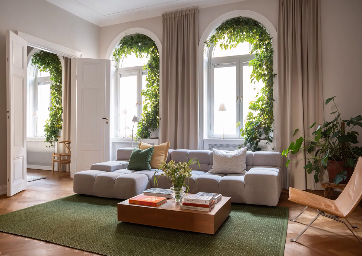 Эта шведская квартира имеет одну интересную особенность, которая выделяет её на фоне типичных скандинавских интерьеров. Дело в том, что в некоторых её комнатах имеются прекрасные арочные окна, украшенные с помощью…. живых вьющихся растений! Смотрится это всё очень необычно и впечатляюще, учитывая ещё и хорошую высоту потолков. Несмотря на то, что окна привлекают на себя всё внимание, в целом интерьер получился спокойным и стильным, с уклоном на современную мебели и детали. Enjoy!