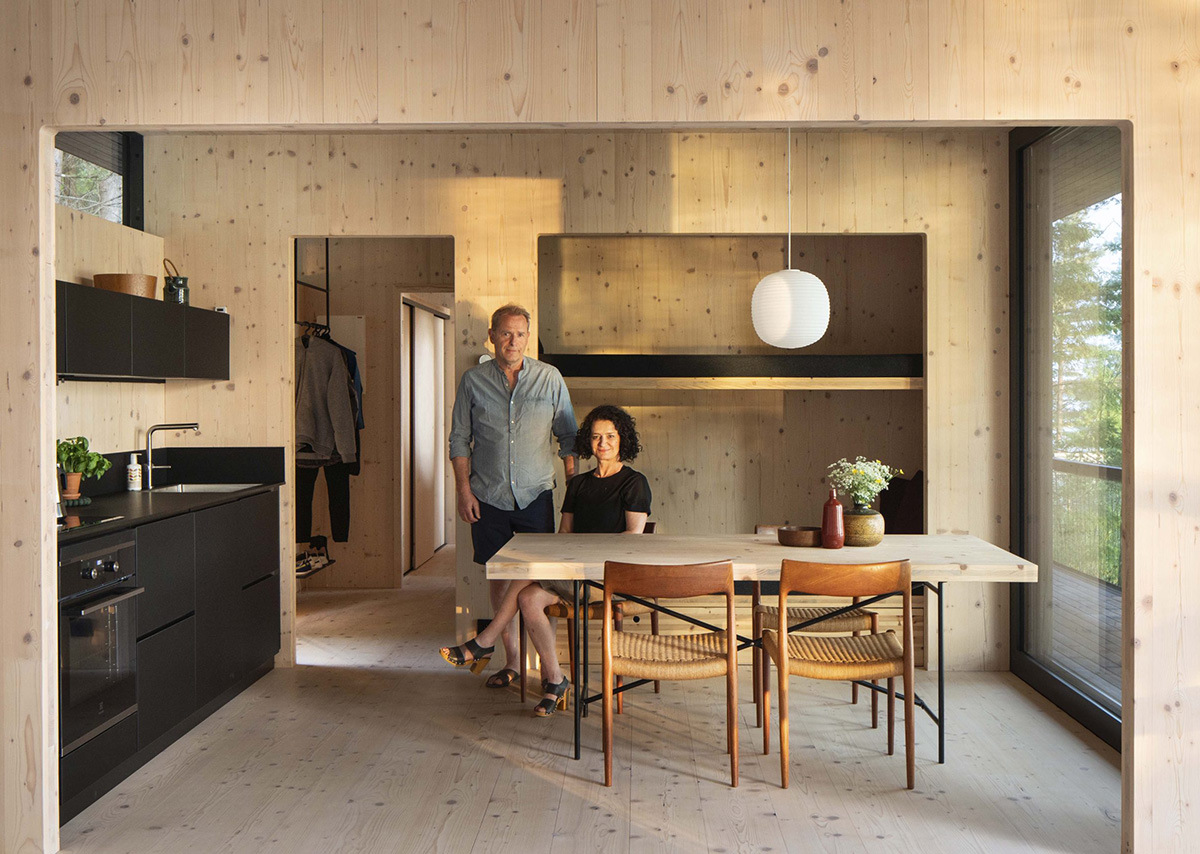 Когда Анне и Фроде планировали строительство загородного дома на живописном участке на берегу озера в центральной Швеции, они хотели сохранить как можно больше деревьев, растений и горных образований, ведь именно они, по мнению пары, придают месту особый характер и атмосферу. Также хозяева хотели, чтобы их дом архитектурно был как можно ниже к земле, не доминировал над ландшафтом — поэтому студия Vardehaugen Arkitekter разработали уникальными минималистичный дизайн дома, состоящий из двух структурных частей. Большие окна от потолка до пола впускают много света в интерьер, в то время как отделка натуральным создаёт приятную и уютную атмосферу.