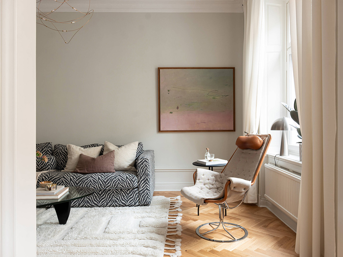 В целом спокойный и нейтральный декор этой элегантной квартиры в старом доме в Стокгольме разбавляет диван с принтом «зебра» в гостиной — дизайнер будто пытаются сказать, что не обязательно всегда очень серьёзно относится к декору классических пространств. Комнаты квартиры впечатляют своими характеристиками и настенной лепниной, но лаконичная современная мебель добавляет им модных и актуальных ноток. Замечательный городской интерьер с отличным балансом старого и нового!
