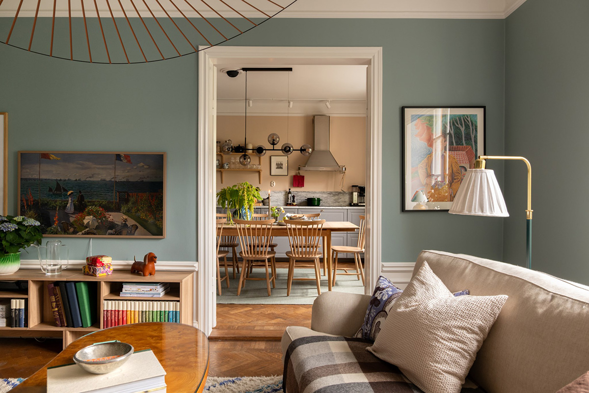 Характерная особенность интерьера этой шведской квартиры — красивые стены, оформленные с помощью необычных красок и обоев. Так, в гостиной настроение создаёт приятный оттенок синего, который стал прекрасным фоном для красочных постеров и другого яркого декора. Кухня, спальня и коридор уже оформлены в персиковых тонах, в то время как в детской мы можем видеть нежные цветочные обои. Смотрится это всё очень живо и уютно. Отдельно внимания заслуживает великолепный старый дом, в котором находится квартира, а также парк со скульптурами рядом с ним. Enjoy!