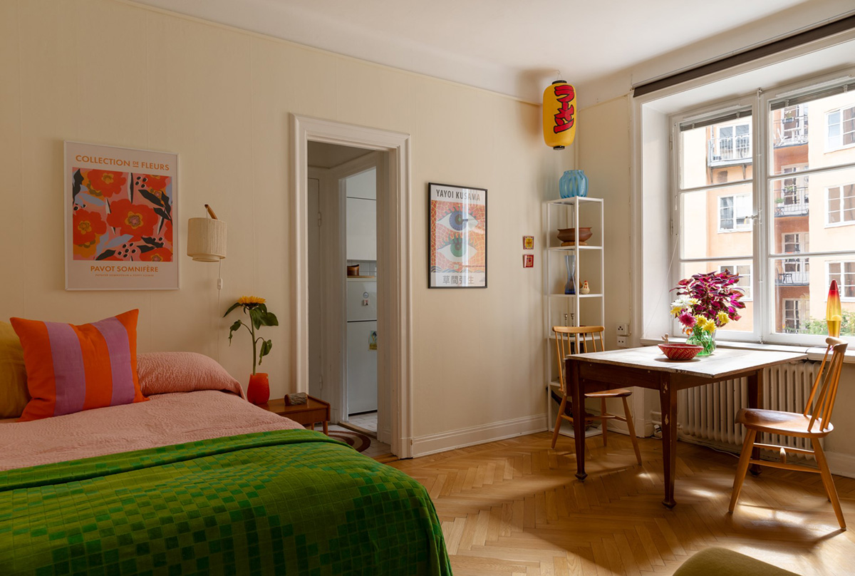 Единственная жилая комната, в которой есть всё: диван для релакса, кровать для сна, стол для принятия пищи и занятий, и даже гитара для занятий музыкой — эта маленькая квартира в Стокгольме идеально подходит для проживания студента. Красочная гамма только лишь усиливает игривый и молодёжный характер жилья. Стоит отметить, что интерьер довольно простой и бюджетный (кухня, например, здесь совсем крошечная), зато какой яркий и уютный!