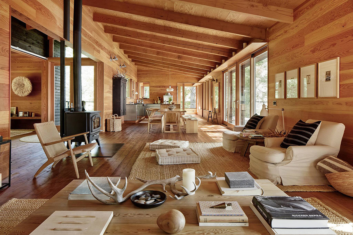 Интерьер этого чудесного дома у озера в провинции Онтарио, Канада, в очередной раз доказывает, что дерево — пожалуй, самый универсальный и уютный натуральный материал в декорировании. Здесь не только буквально все поверхности отделаны деревом, но и большая часть мебели также деревянная — и интерьер совсем не кажется скучным или тяжелым. Наоборот, внутреннее пространство дома выглядит уютно и вдохновляюще, особенно с такими видами на прекрасную природу. Приятный однотонный текстиль и лаконичные современные детали замечательно дополнили картину, подчеркнув всю красоту деревянного интерьера!